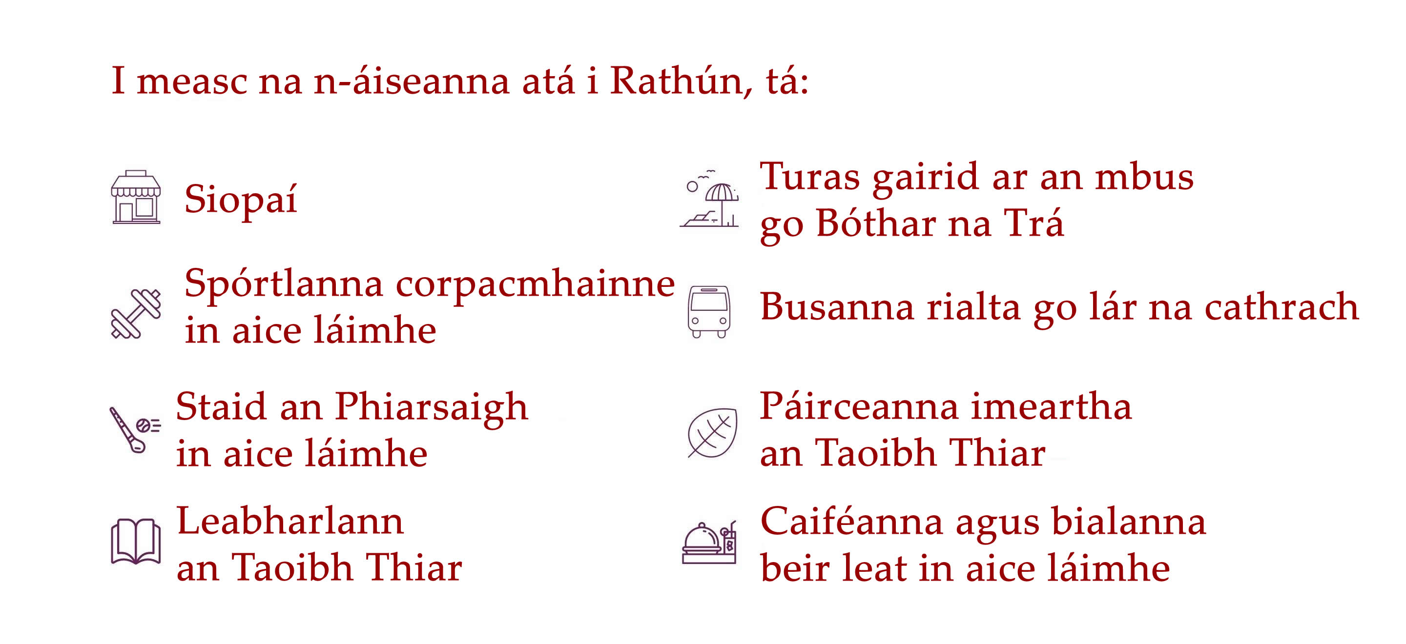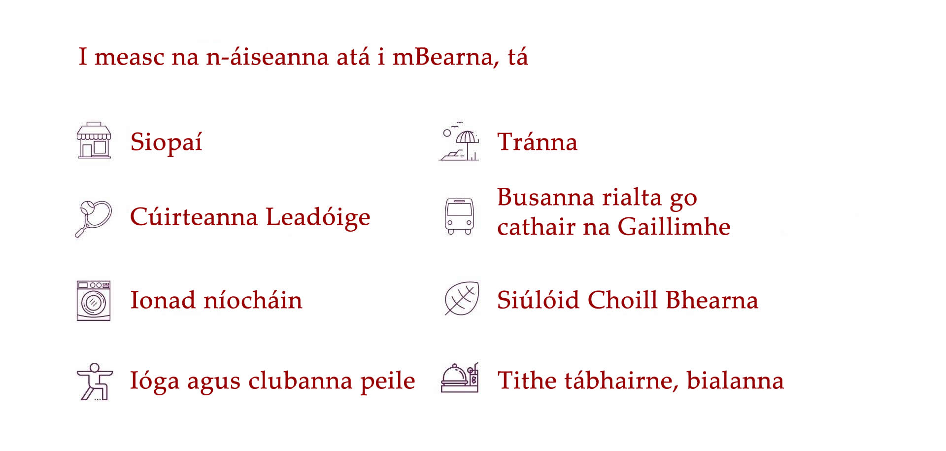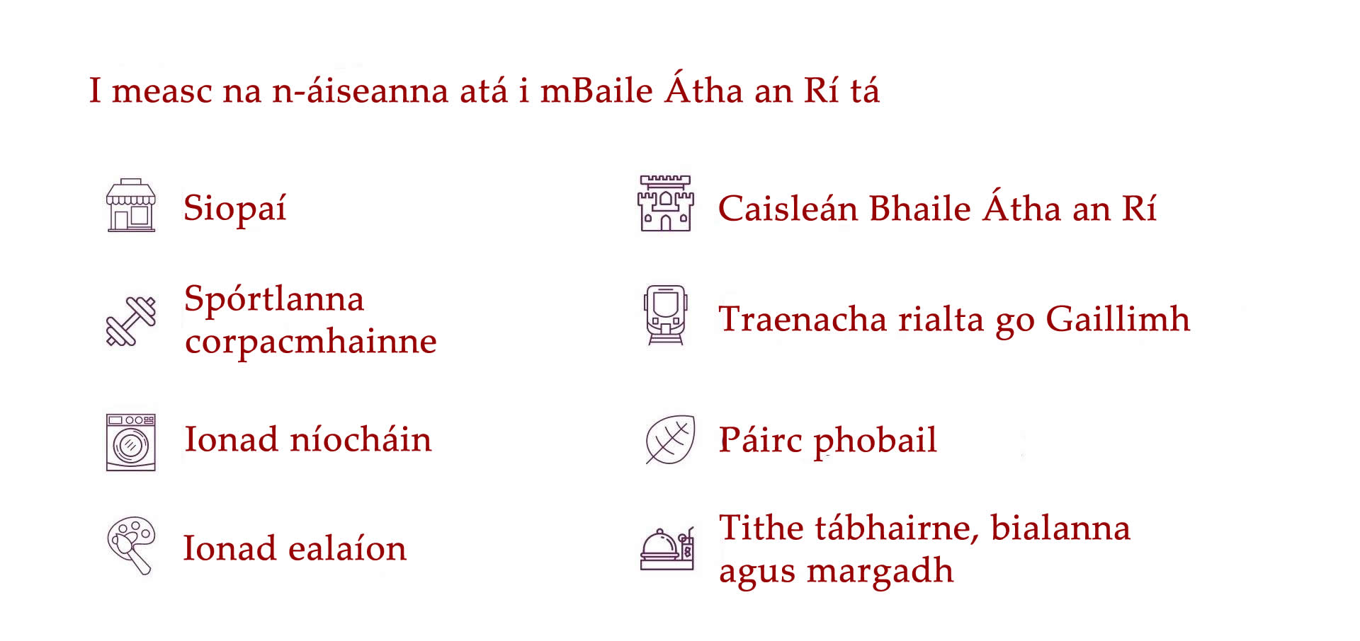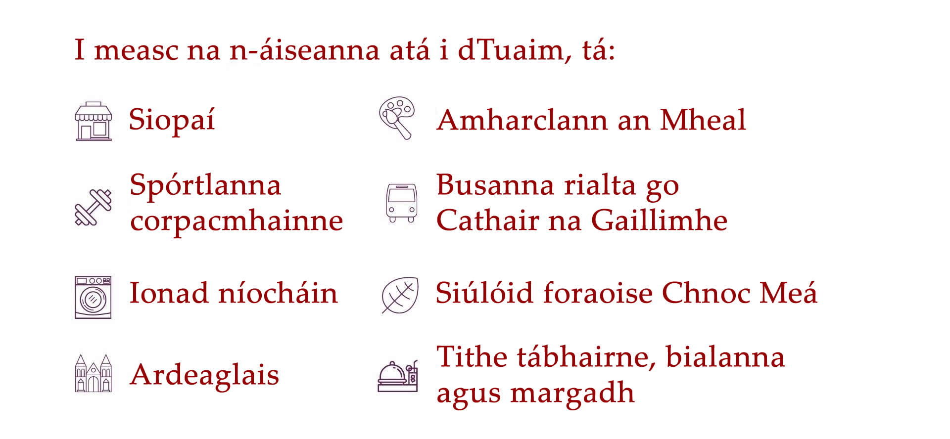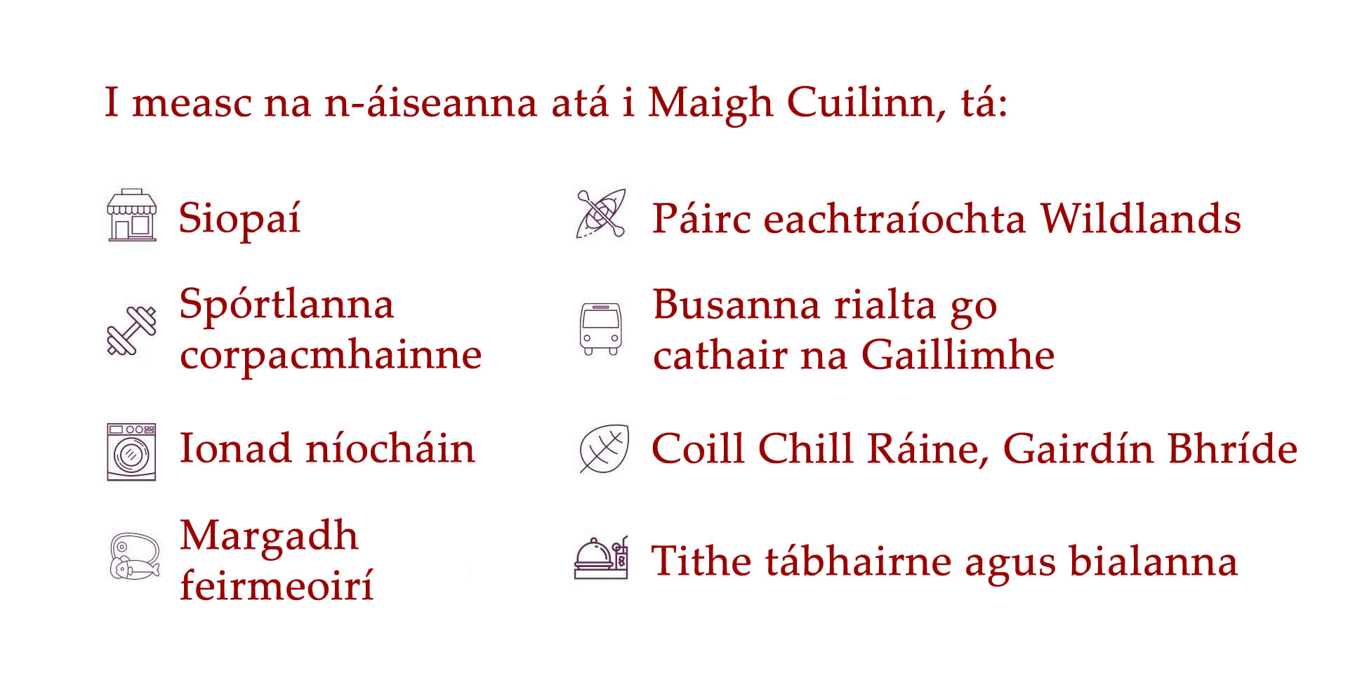Tá níos mó eolais faoi limistéir lóistín na Gaillimhe le fáil thíos.